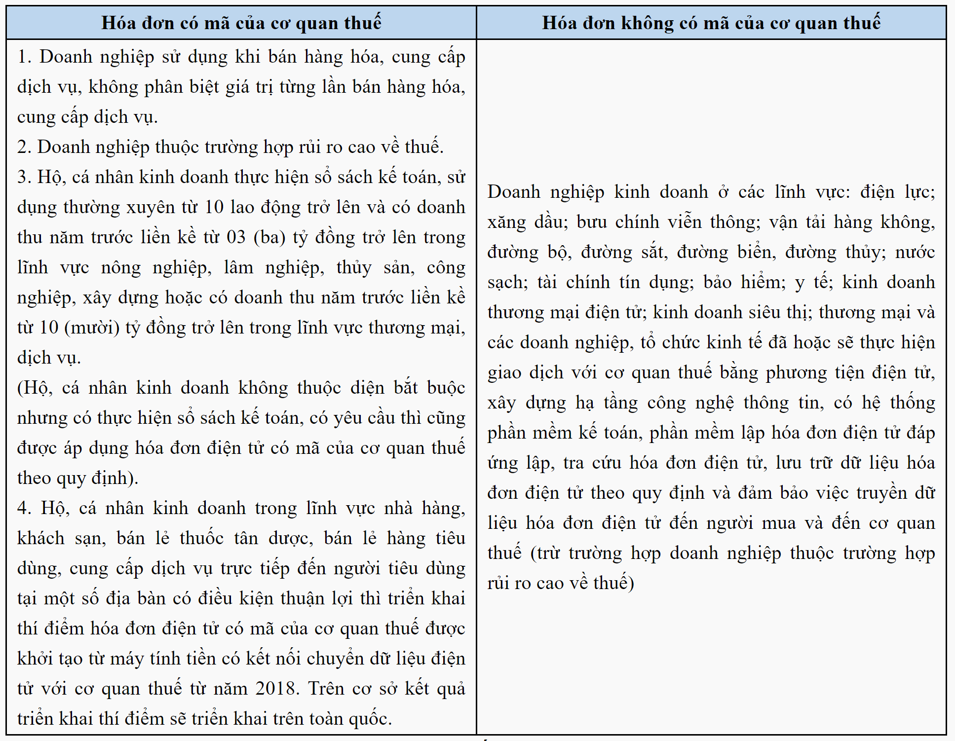 Đối tượng áp dụng hóa đơn điện tử có mã và không có mã của cơ quan thuế: